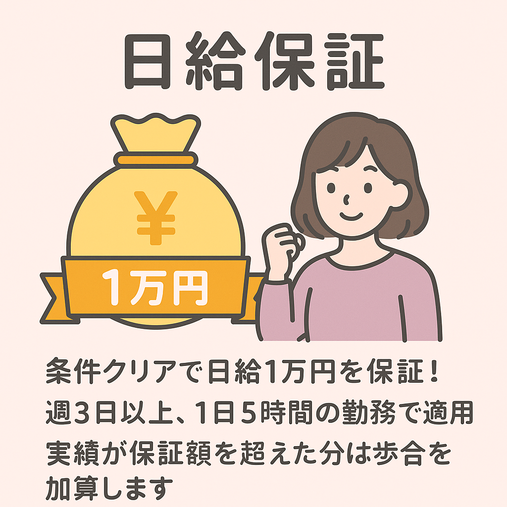 - 希望者のみ「日給保証」「時給制」を選択可能(要面接・条件あり)
