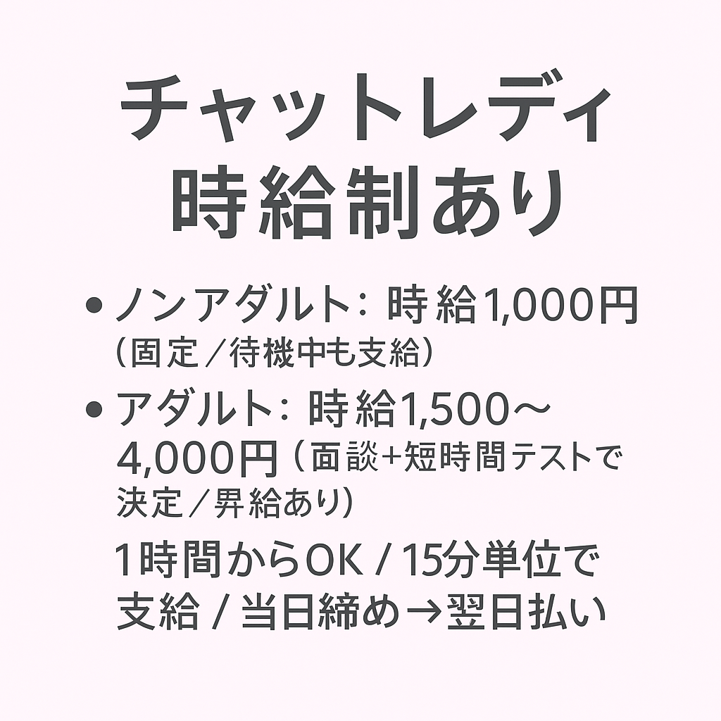 - アダルト:時給1,500〜3,000円(実績により昇給/上限4,000円)